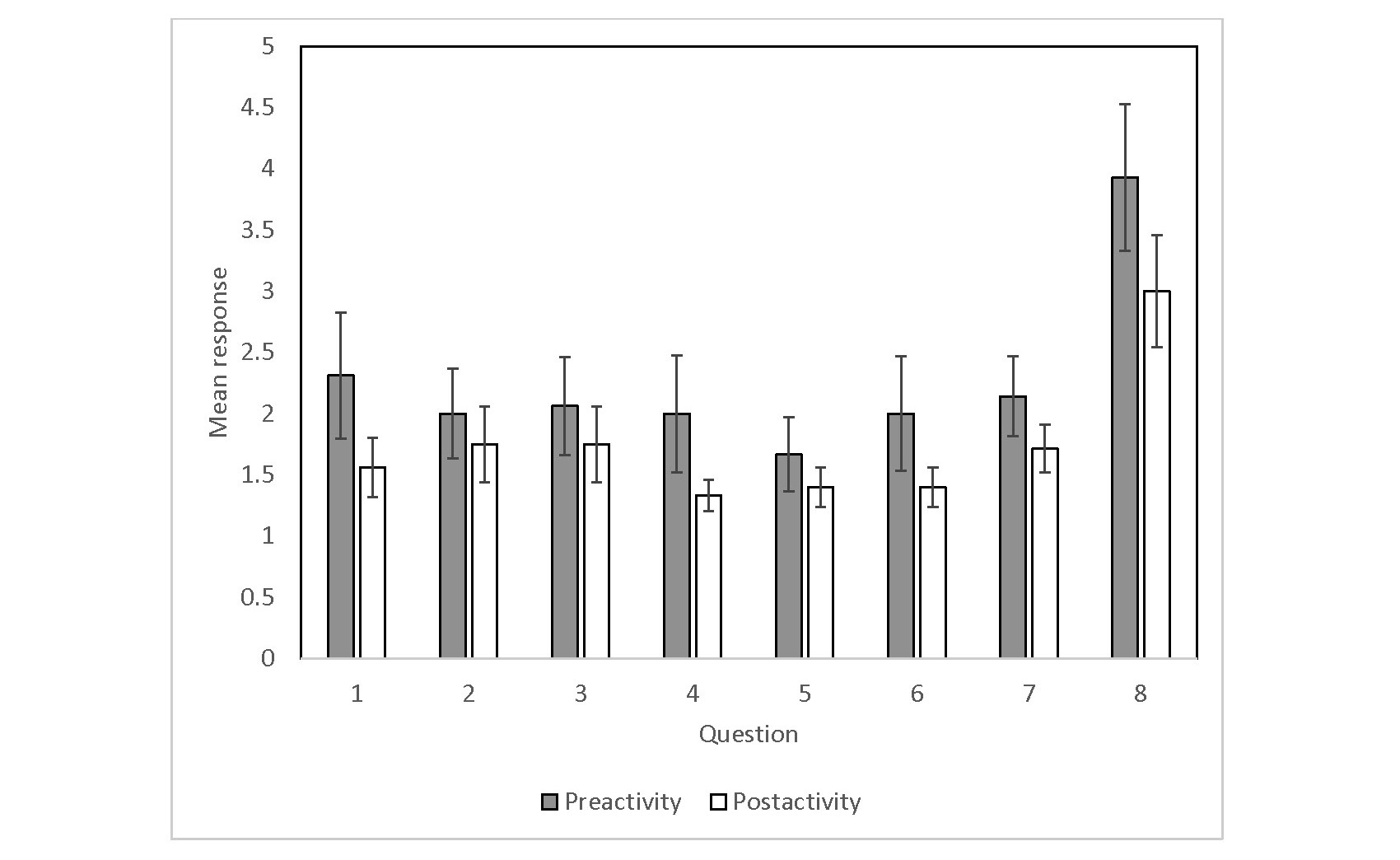 Note. The text of the questions can be found in Table 1. Lower numbers represent assigning less blame to individuals with ADHD and/or greater belief in the brain basis of ADHD. N=14-16 depending on the question (p > .05 for all questions, Wilcoxon sign-rank tests). Error bars represent standard error.