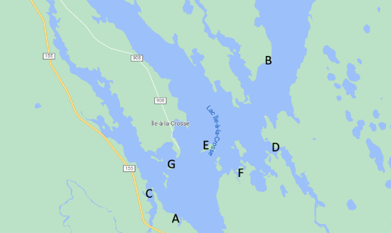 Note. Map of Île à la Crosse area. A= Niyâwahkahk; B= Niyâwahkâsihk; C= Opâsêw Sîpî; D= Amisko Sîpî; E= La ķrrôsil; F= Asawâpêw Wâsaķâmîciķan; G= Ali Baloo. Adapted from Map Data © 2022 Google (https://www.google.com/maps/@55.4328039,-107.8479807,11z).