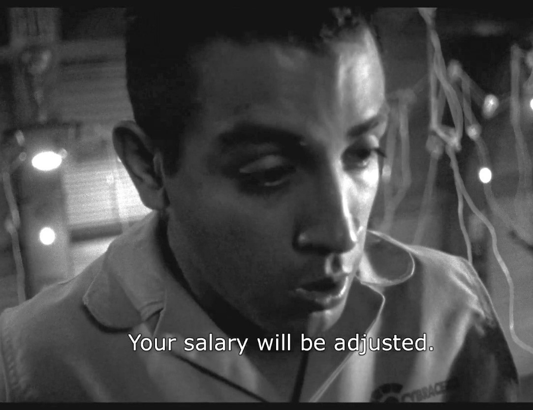 Figure 1 Image of the Main Character Memo as a Node Worker Note. Image from the film Sleep Dealer (Rivera, 2008, 39:13). Copyright 2008 by Alex Rivera. Used with permission. |